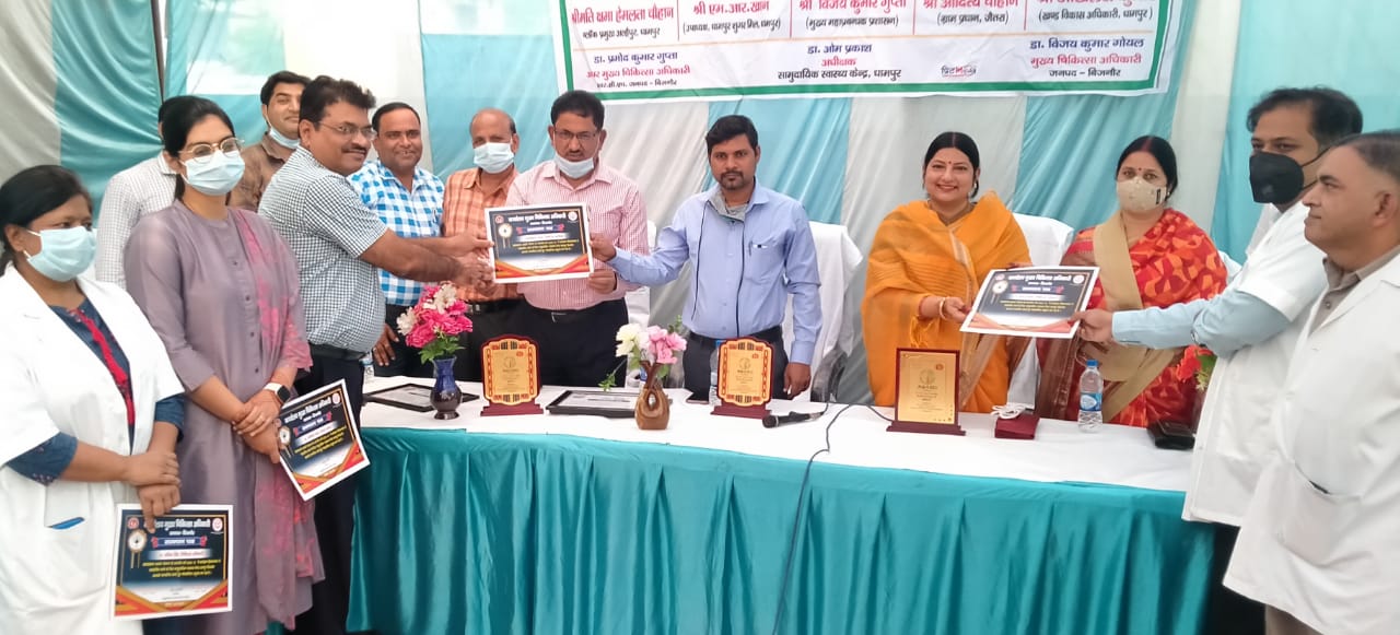 प्रदेश में मौजूद सभी सीएचसी में कायाकल्प योजना के तहत हुए कार्यों में धामपुर सीएचसी को प्रदेश में 51वीं रैंक प्राप्त हुई है, जिसको लेकर सीएचसी परिसर में कायाकल्प सम्मान समारोह का आयोजन किया गया, कार्यक्रम में मुख्य अतिथि के रूप में ब्लाक प्रमुख क्षमा हेमलता चौहान और शुगर मिल धामपुर के कारखाना प्रबंधक विजय कुमार गुप्ता मौजूद रहे, इस दौरान कायाकल्प सम्मान समारोह में सीएचसी प्रभारी डा. ओमप्रकाश यादव, डा. रमेश बंसल, डा. मानस चौहान आदि सहित सभी स्टाफ को मुख्य अतिथियों ने प्रशस्ति पत्र देकर सम्मानित किया, ब्लॉक प्रमुख क्षमा हेमलता चौहान ने चिकित्सकों को बधाई देते हुए कहा-डा. ओमप्रकाश यादव ने बताया कि सरकार की ओर प्रदेश की 700 से अधिक सीएचसी में सर्वे कराया गया था, सीएचसी में कायाकल्प योजना के तहत विभिन्न प्रकार के कार्य कराए गए थे, जिसमें शुगर मिल और ब्लाक प्रशासन का भी सहयोग रहा था, इसमें मरीजों की सुविधा के लिए टीन शेड, बैठने की सुविधा, पेयजल और संपर्क मार्ग आदि के आधार पर कार्य कराए गए थे, धामपुर सीएचसी को 51वीं रैंक हासिल हुई है, सम्मानित होने वालों में डा. अंबिका, सविता सिंह, ब्रिजेश कुमार, सुनील कुमार, यतेंद्र जुआल आदि शामिल रहे।