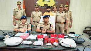 पुलिस अधीक्षक दिनेश सिंह द्वारा जनपद में नशीले पदार्थों के क्रय विक्रय आदि करने वाले अपराधियों के विरुद्ध कड़ी कार्यवाही करने तथा आरोपियों की गिरफ्तारी हेतु चलाए जा रहे अभियान के तहत नशीले पदार्थों का प्रयोग करने वाले लोगों को नशे से छुटकारा दिलाने हेतु नया सवेरा अभियान की शुरुआत की गई, जिसके तहत अपर पुलिस अधीक्षक ग्रामीण ग्रामीण पुलिस क्षेत्राधिकारी चांदपुर सुनीता दहिया के कुशल पर्यवेक्षण, प्रभारी निरीक्षक के निर्देशन में नशीले पदार्थों की रोकथाम के लिए टीम गठित की गई, टीम द्वारा चेकिंग के दौरान कस्बा चांदपुर के धनोरा फाटक के पास से हरदोई जिले के रहने वाले राजन उर्फ राजू शर्मा को गिरफ्तार किया गया जो हाल ही में थाना चांदपुर के मोहल्ला सराय रफी का रहने वाला है, पुलिस ने अभियुक्त की निशानदेही पर भारी मात्रा में अवैध गांजा, भांग के गोलिया, नशीले पदार्थ बनाने में प्रयुक्त विभिन्न प्रकार के पेपर व पेपर स्टिक, नशीला पदार्थ तथा विक्रय किए गए नशीले पदार्थ से प्राप्त ₹12600 बरामद किए, आरोपी को पकड़ने वाली टीम में प्रभारी निरीक्षक सतीष कुमार राय, उपनिरीक्षक सुमित राठी, जितेंद्र सिंह, कांस्टेबल राजेश , गजेंद्र, पुष्पेंद्र , अमित कुमार आदि शामिल रहे